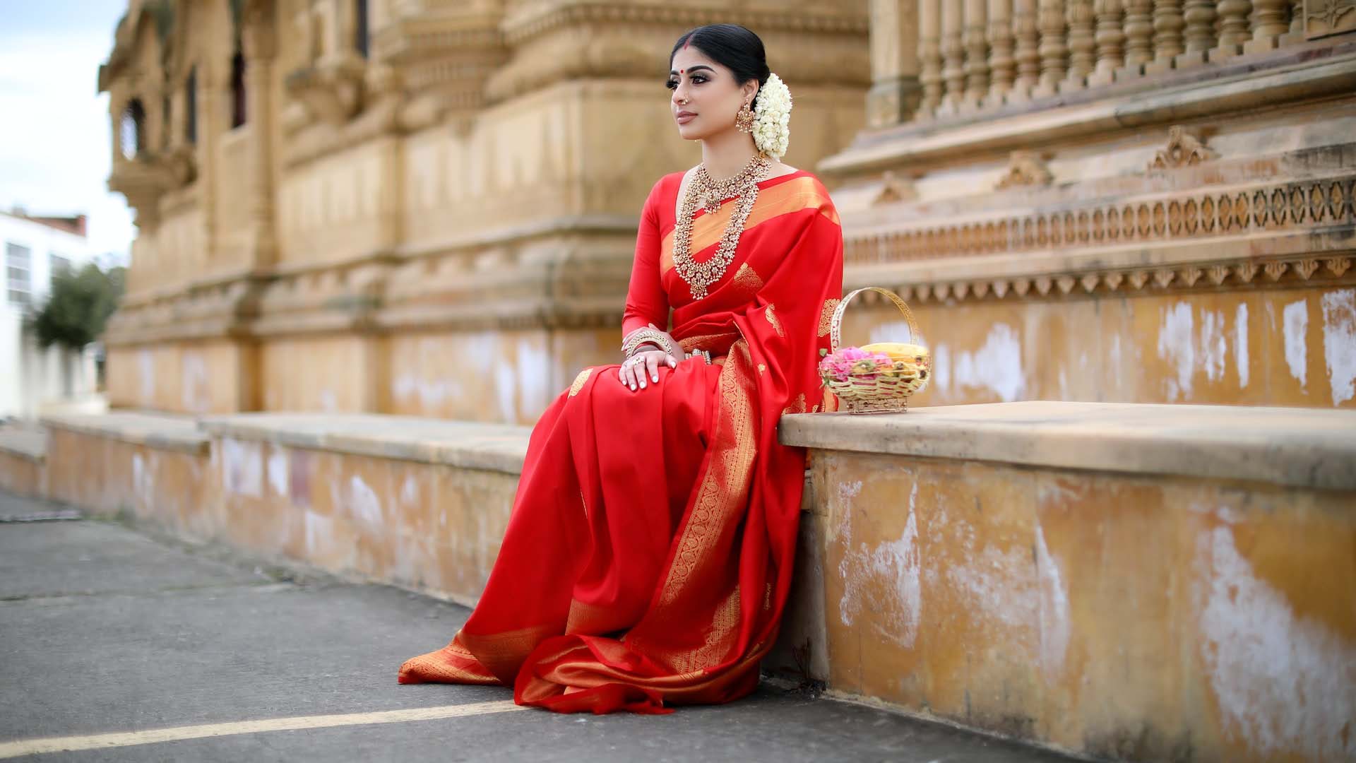 - Put the Pallu over your right shoulder and spread them to cover the bust.